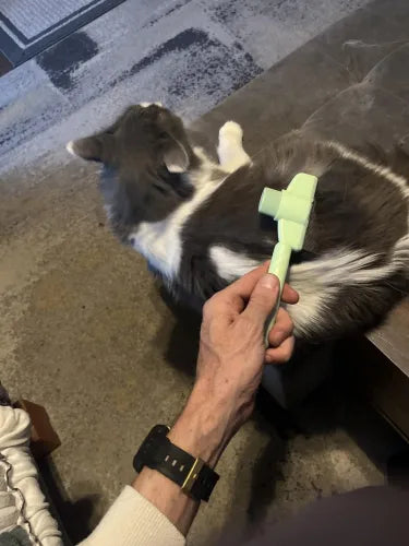 Masajea la piel de tu gato, gracias a sus dientes con puntas completamente redondeadas. Su diseño penetra hasta la raíz sin jalar. Por eso los gatos ronronean en lugar de huir.